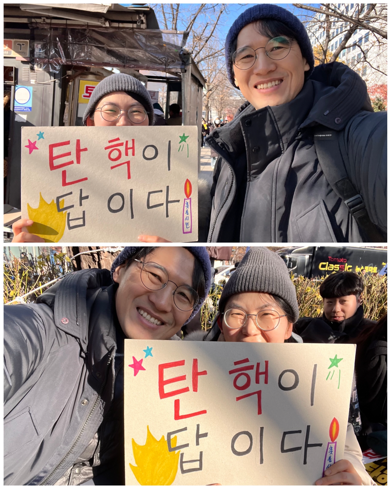 평소 같으면 여유를 부리고 있을 토요일 오전인데 마음이 바빴다. 오늘은 결전의 날! 요새 다들 응원봉을 들고 나온다는데, 나는 응원봉도 미리 주문한 깃발도 없으니 고전적으로 피켓을 만들어가야겠다 싶었다. 아이 방에서 두꺼운 마분지 하나와 열두 색의 매직을 꺼내 들었다. 뭐라고 쓸까 고민하다 앞면에는 “탄핵이 답이다” 뒷면에는 영어로 “YOON OUT"이라고 적었다. 가장자리에는 희망을 상징하는 별과 간절한 염원을 담은 촛불, 타오르는 분노를 표현하는 불꽃을 그려 넣었다. 글자 하나, 그림 하나에 탄식과 기도를 새겨 넣었다. 지켜보던 아이도 나서서 꾸미기에 동참해 주었다. 그렇지, 이게 살아있는 민주시민교육일세!