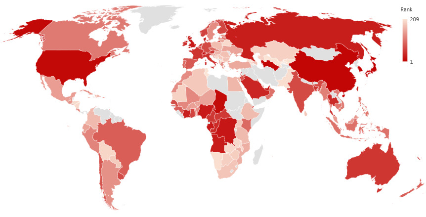 하지만 아시아에서도 인도네시아, 말레이시아, 인도가 원유를 수출하지만 물가 수준은 더 저렴하다. 전 세계 도시의 물가 수준을 랭킹화하여 아래 지도를 그려봤다.(데이터 원본) 물가 수준이 높을수록 진한 빨간색이고 낮을수록 하얀색이다. 한 국가 내 여러 도시의 데이터가 있으면 가장 물가가 높은 곳을 기준으로 했다.