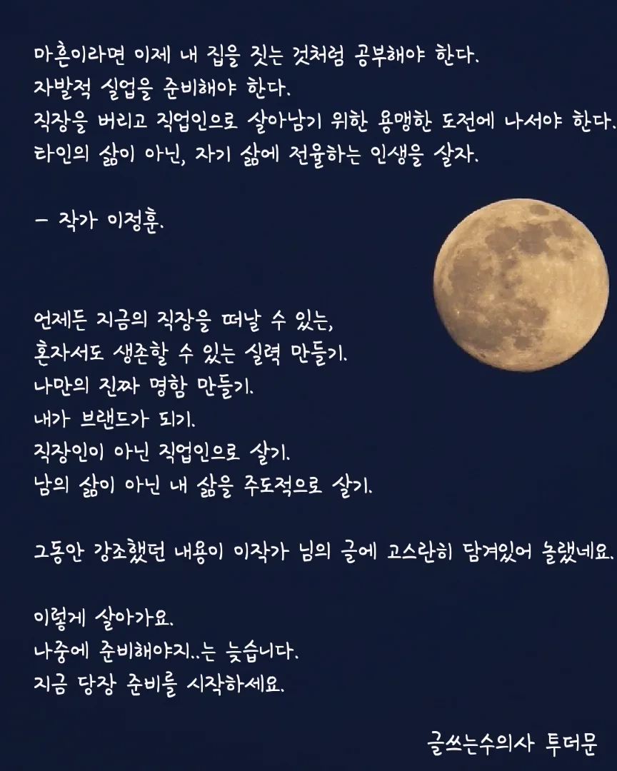 X의 글쓰는수의사 투더문(Tothemoon)님(@Tothemoon_Park) ✅️https://t.co/lzoDUVstbo ✅️https://t.co/R4t9RmnCL7 공감합니다. 그래서 실력을 키우는 게 1번입니다. 그것은 곧 직장인에서 직업인으로의 준비, 언제든 떠날 수 있는 준비를 의미합니다. 선택권과 결