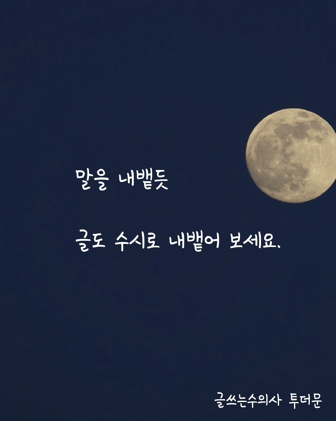 글 쓰는 행위를 너무 가벼이 여겨서도 안 되지만 반대로 너무 엄숙하게 대할 필요도 없습니다. 그럼 글쓰기에 가까이 다가가지 못해요. 거리감은 글쓰기와 친해지고 내 몸에 배는데 방해가 됩니다. 글과 내가 한 몸이 되어야 자연스럽게 물 흐르듯 쓸 수 있습니다