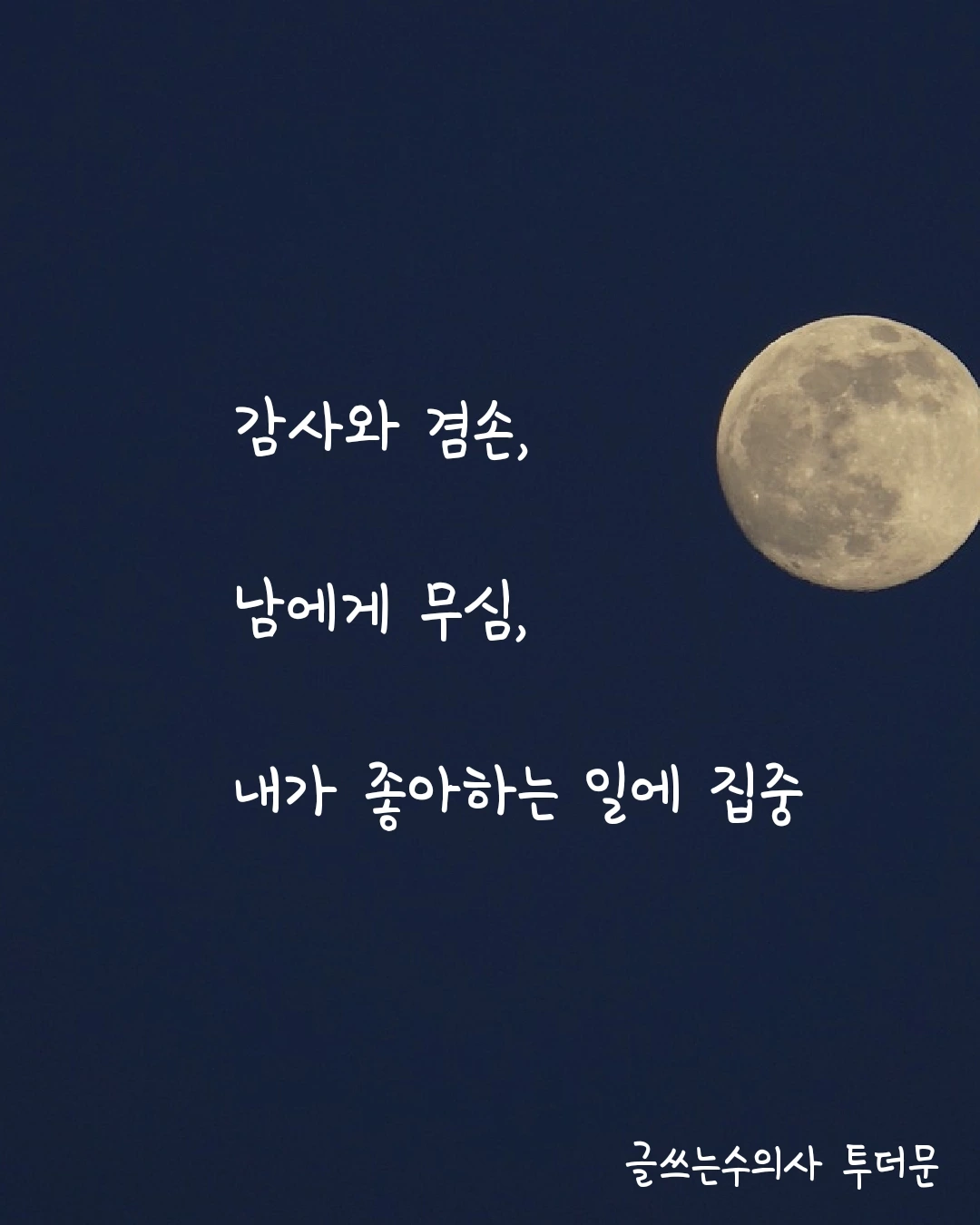 감사, 겸손, 성실, 기본, 열정, 의지, 좋은 습관 및 루틴, 욕심 버리기, 인성, 꾸준함, 좋아하는 일에 집중, 주도적인 삶, 남에게 무심, 행복, 고진감래, 새옹지마.