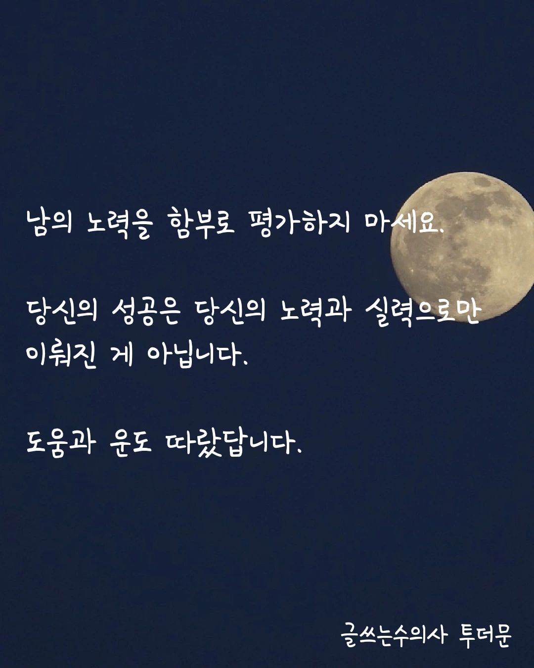 X의 글쓰는수의사 투더문(Tothemoon)님(@Tothemoon_Park) https://t.co/QEyVQxuo27 능력주의 사회의 약점 중 하나다. 결과가 좋지 못한 사람, 한 줄로 세웠을 때 상위권에서 벗어난 사람에게 너의 능력이 부족해서, 너의 노력이 부족해서 그렇다 쉽게 말한다.