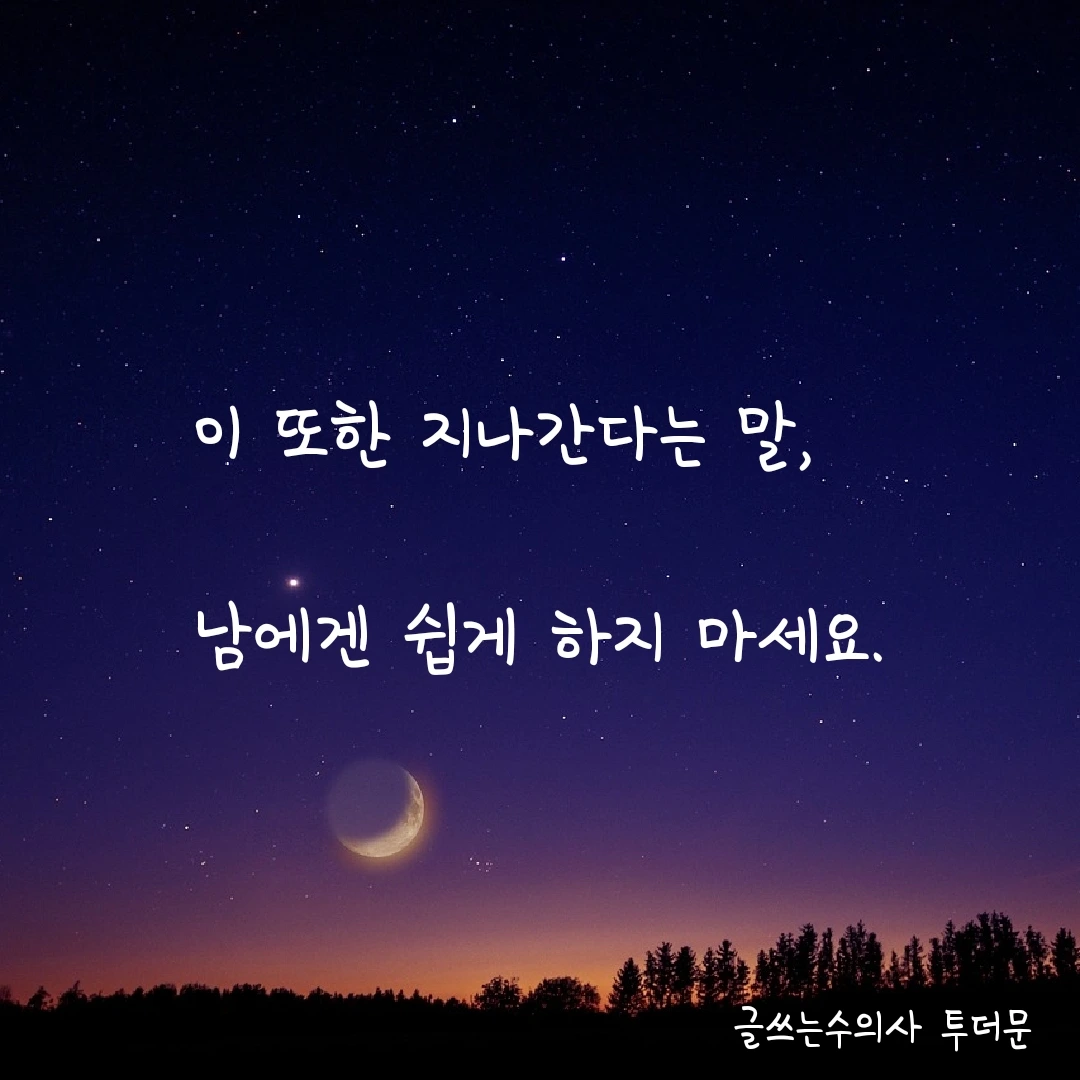 "지나고 나면 다 괜찮아질 거야"라고 쉽게 말하지 마세요. 저는 아직 지나기 전이거든요. - 작가 스테르담. 흔히 하는 말이죠. 잘 생각하고 말해야 해요. 아직 터널을 지나기 전인데, 한참 헤매고