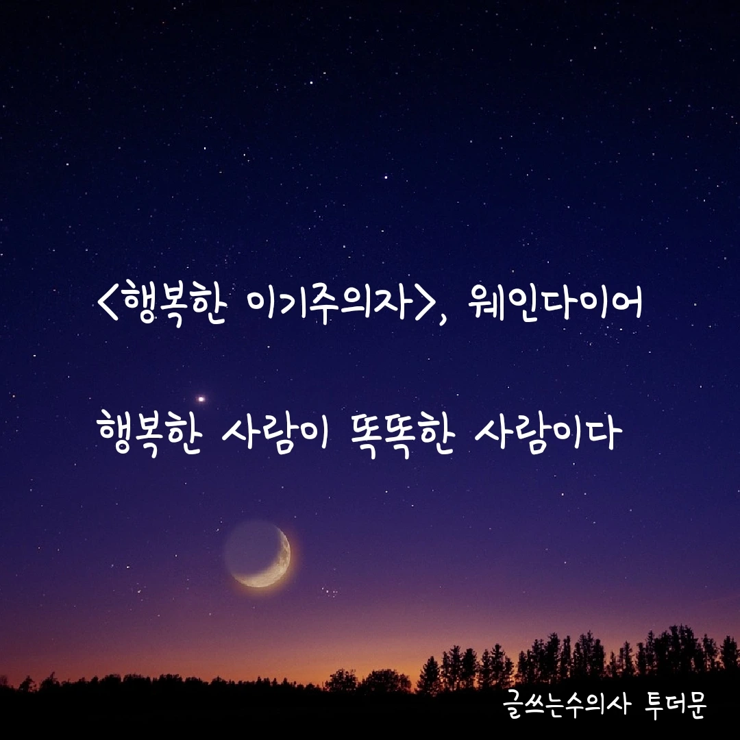 책의 골자는 인생은 단 한 번이니 현재에 충실하고 심지를 내 안에 두어 행복한 이기주의자로 살자는 겁니다.