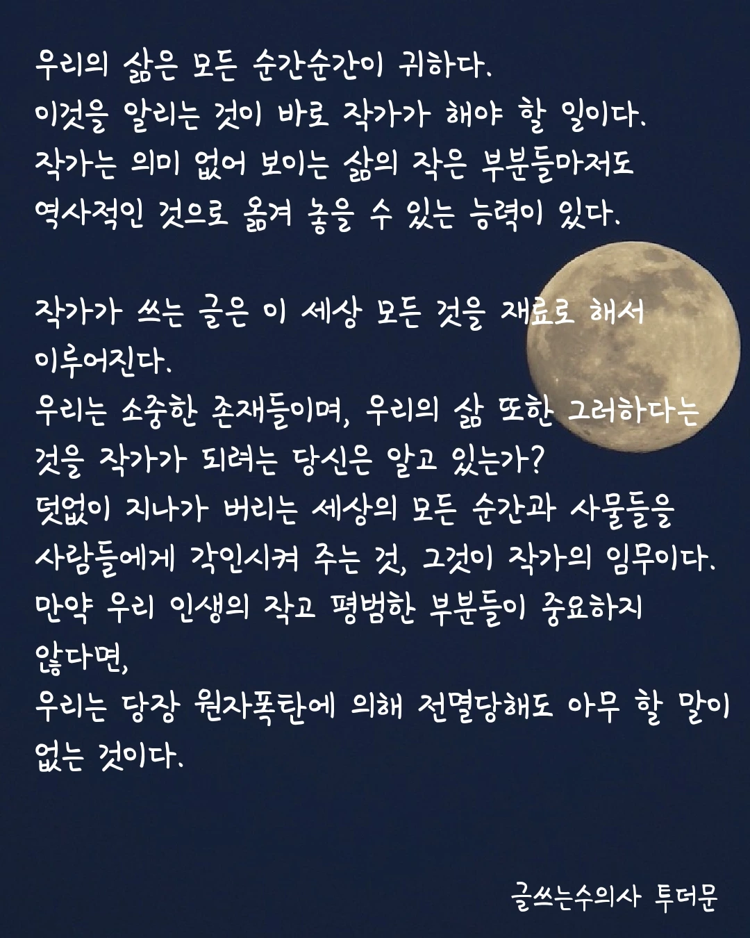 우리의 삶은 모든 순간순간이 귀하다. 이것을 알리는 것이 바로 작가가 해야 할 일이다. 작가는 의미 없어 보이는 삶의 작은 부분들마저도 역사적인 것으로 옮겨 놓을 수 있는 능력이 있다.