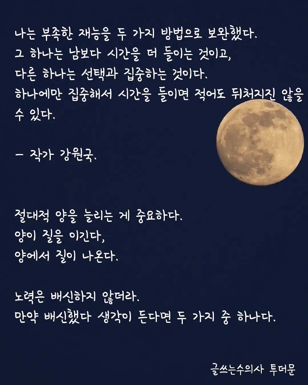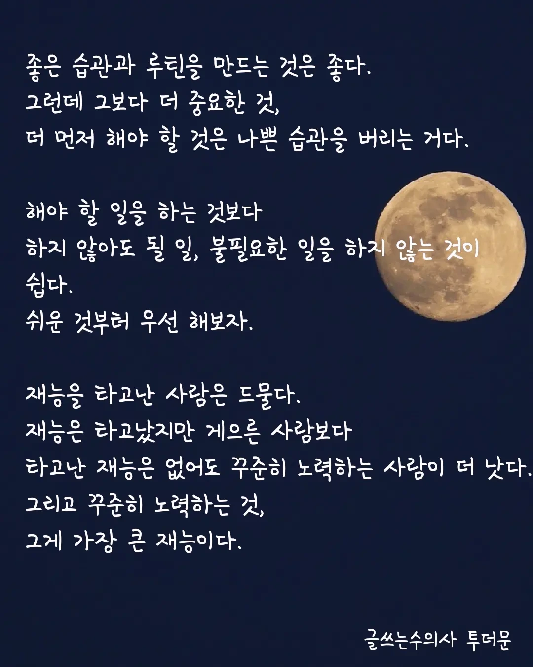 재능을 타고난 사람은 드물다. 재능은 타고났지만 게으른 사람보다 타고난 재능은 없어도 꾸준히 노력하는 사람이 더 낫다. 그리고 꾸준히 노력하는 것, 그게 가장 큰 재능이다.