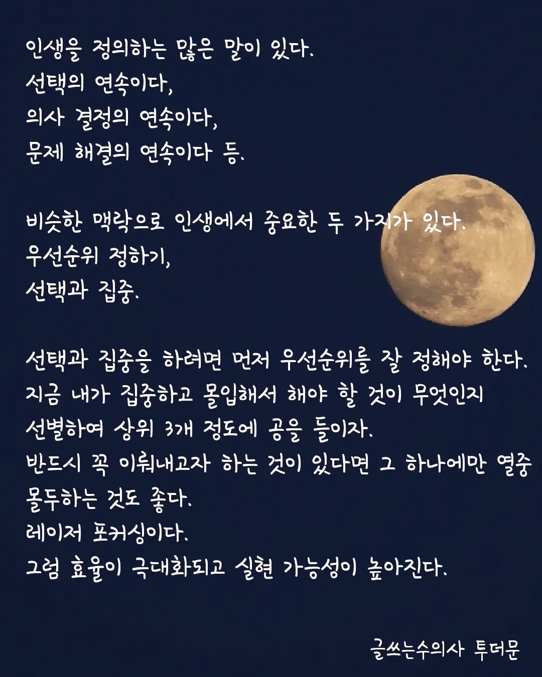 선택과 집중을 하려면 먼저 우선순위를 잘 정해야 한다. 지금 내가 집중하고 몰입해서 해야 할 것이 무엇인지 선별하여 상위 3개 정도에 공을 들이자. 반드시 꼭 이뤄내고자 하는 것이 있다면 그 하나에만 열중 몰두하는 것도 좋다. 레이저 포커싱이다. 그럼 효율이 극대화되고 실현 가능성이 높아진다.