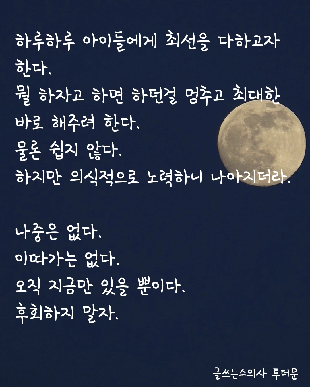 하루하루 아이들에게 최선을 다하고자 한다. 뭘 하자고 하면 하던걸 멈추고 최대한 바로 해주려 한다. 물론 쉽지 않다. 하지만 의식적으로 노력하니 나아지더라.