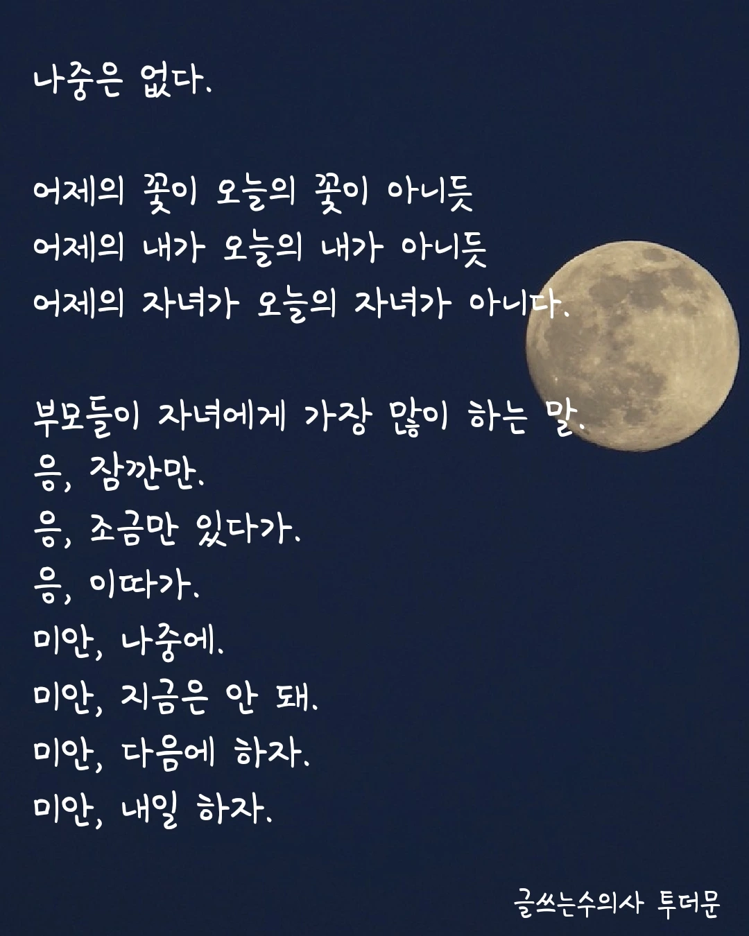 부모들이 자녀에게 가장 많이 하는 말. 응, 잠깐만. 응, 조금만 있다가. 응, 이따가. 미안, 나중에. 미안, 지금은 안 돼. 미안, 다음에 하자. 미안, 내일 하자.