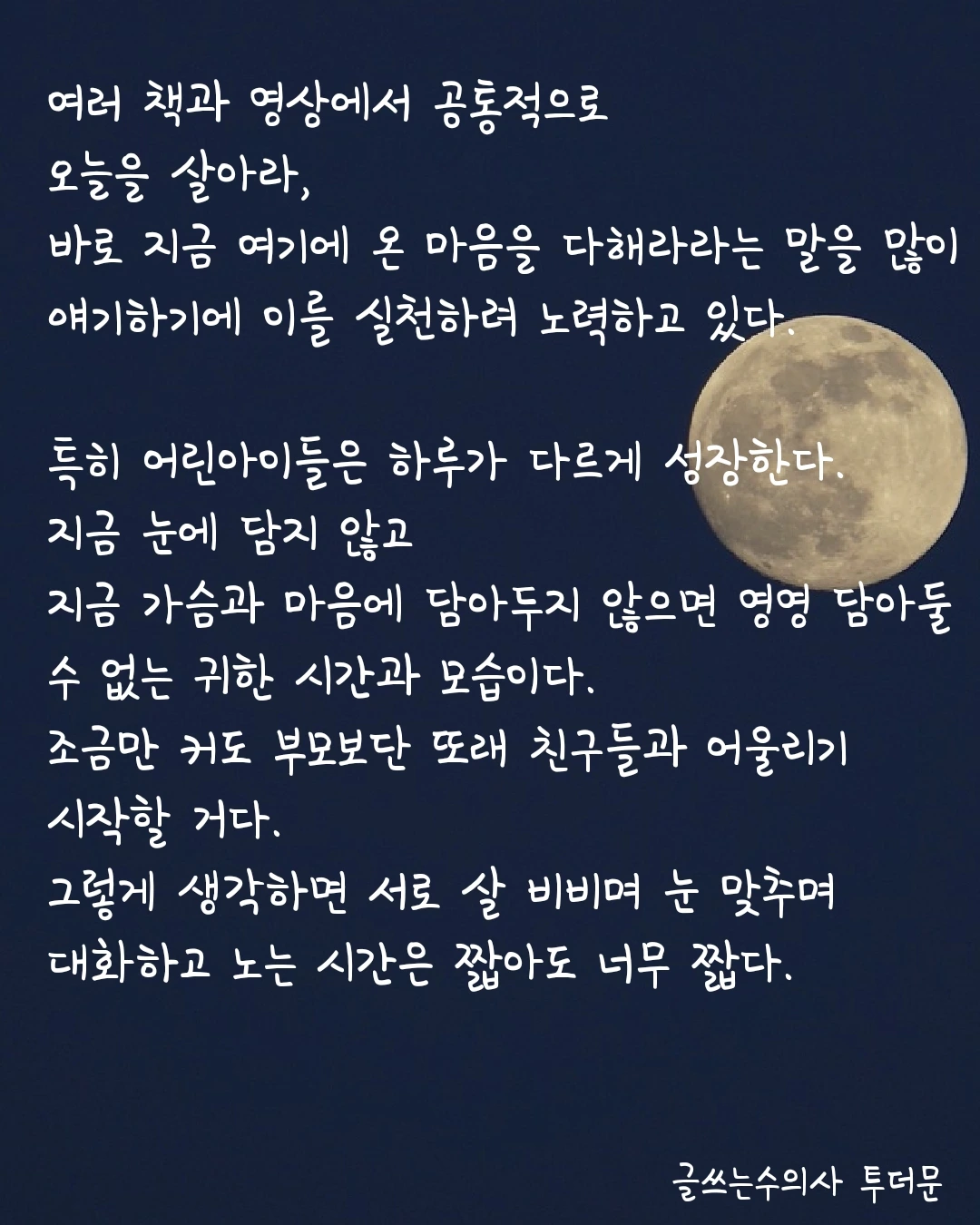 특히 어린아이들은 하루가 다르게 성장한다. 지금 눈에 담지 않고 지금 가슴과 마음에 담아두지 않으면 영영 담아둘 수 없는 귀한 시간과 모습이다. 조금만 커도 부모보단 또래 친구들과 어울리기 시작할 거다. 그렇게 생각하면 서로 살 비비며 눈 맞추며 대화하고 노는 시간은 짧아도 너무 짧다.
