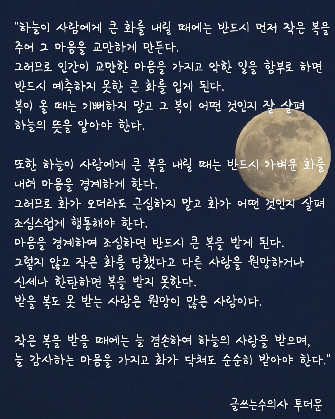 복이 올 때는 기뻐하지 말고 그 복이 어떤 것인지 잘 살펴 하늘의 뜻을 알아야 한다.