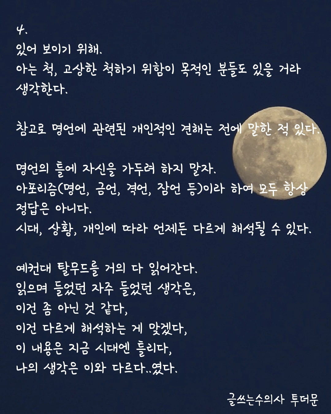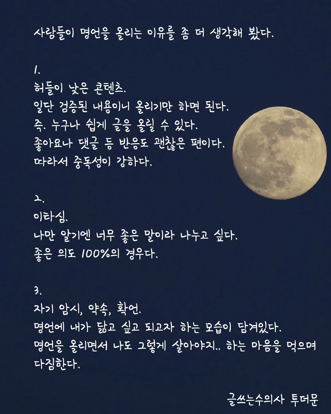 명언 관련이 내용이 가장 공감되었다. 나도 초기엔 명언을 그대로 올린 적이 있다. 너무 좋은 말이니까. 나 혼자만 보기엔 너무 아까우니까. 다른 사람들도 같이 보면 참 좋겠기에. 그런데 좀 더