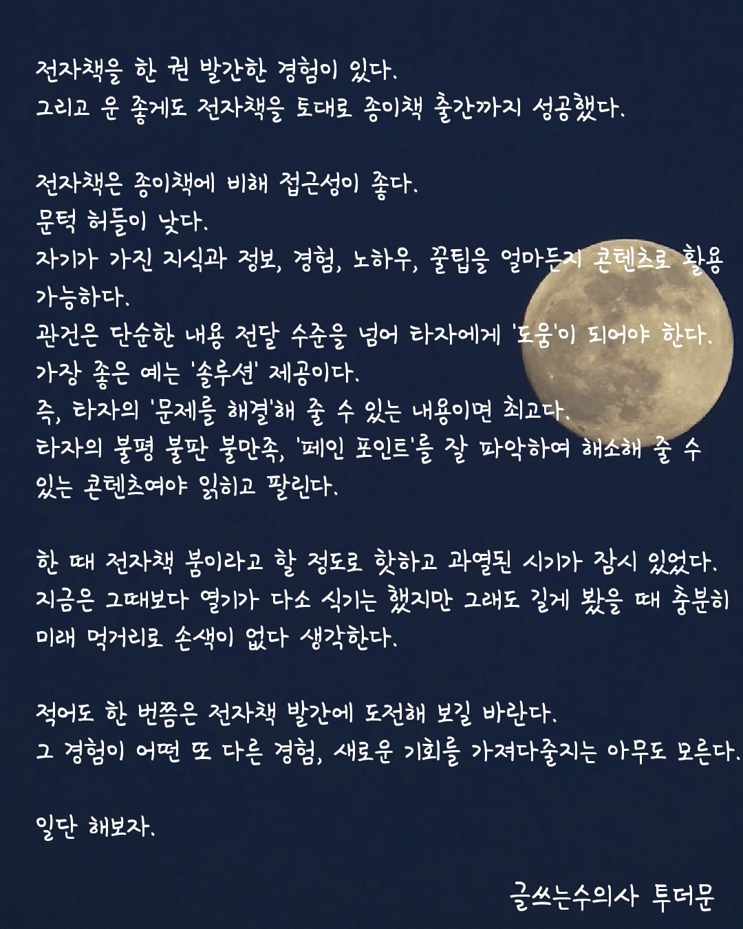 <내가 전자책에 집중하는 이유> 보통 사람들의 책쓰기가 늘어난다. 이제 1인 출판업 대세가 될 것이다. 은퇴 후, 시니어에게도 기회다. 그렇다고 아무나 쓸 수는 없다. 준비된 자에게만 열리는 문