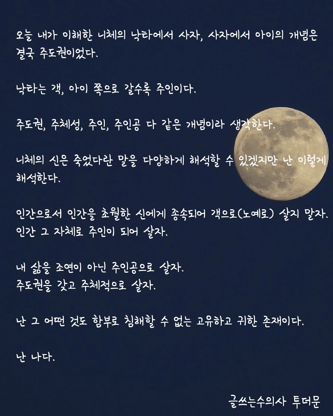 예나 지금이나 목표가 있다. 이전에는 주어진 목표가 있었다. 학창 시절과 직장 생활이 그래서 힘들었다. 지금은 내가 목표를 정한다. 그런 목표는 내게 활력을 주고 성취감을 선사한다. - 작가