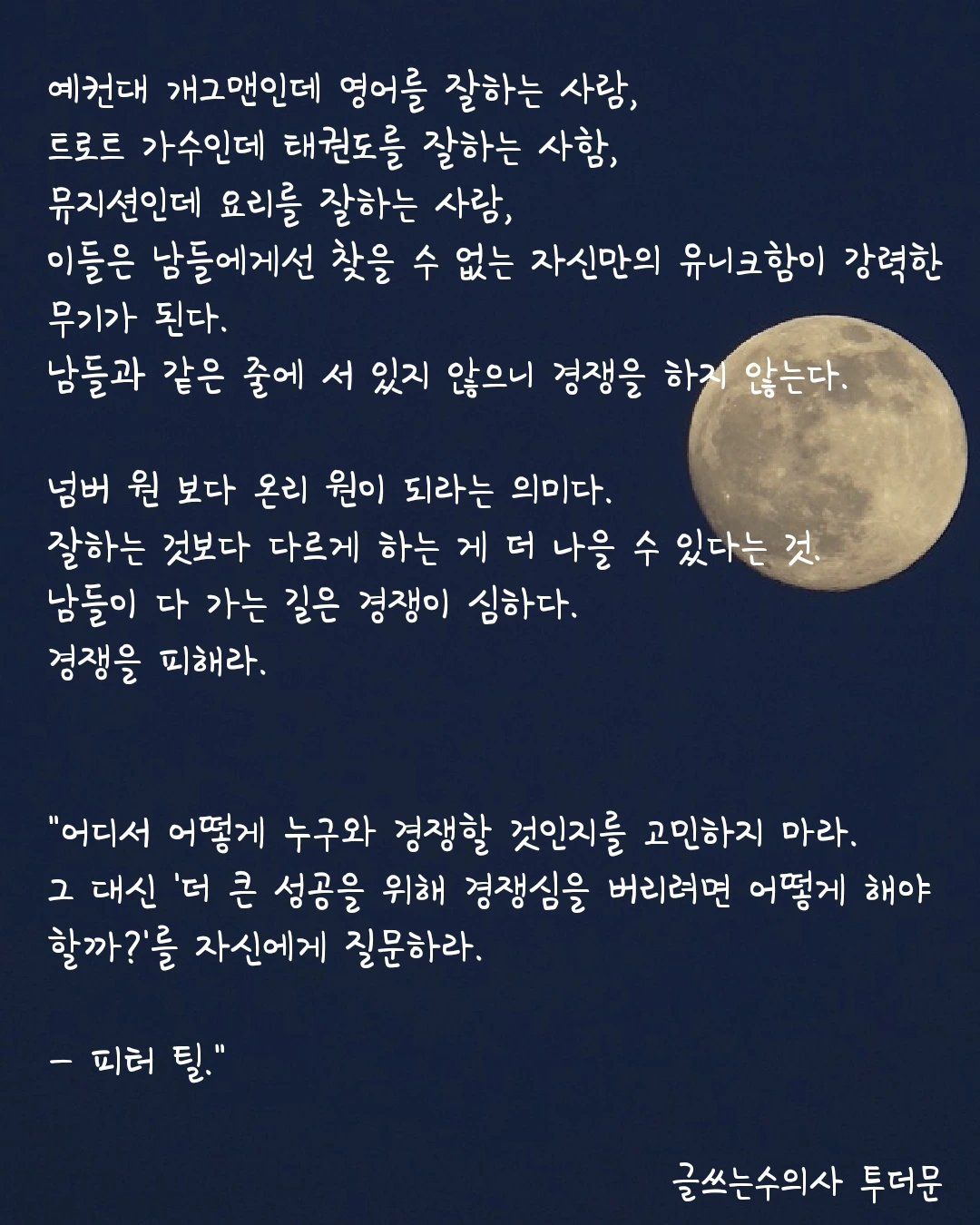 https://t.co/bbhwSX0Lcn "어디서 어떻게 누구와 경쟁할 것인지를 고민하지 마라. 그 대신 '더 큰 성공을 위해 경쟁심을 버리려면 어떻게 해야 할까?'를 자신에게 질문하라." - 피터 틸. 넘버원보다 온리