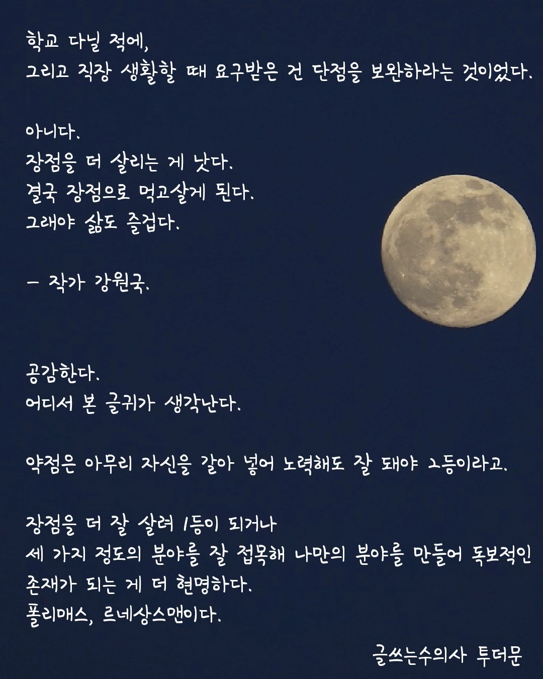 ✅️ 나만의 콘텐츠, 스타일, 영역을 만드는 게 중요하다. 그러면 남과 비교할 일도, 경쟁할 일도 없어진다. 나답게 살 수 있다. - 작가 강원국. ✅️ 어디서 어떻게 누구와 경쟁할 것인지를 고민