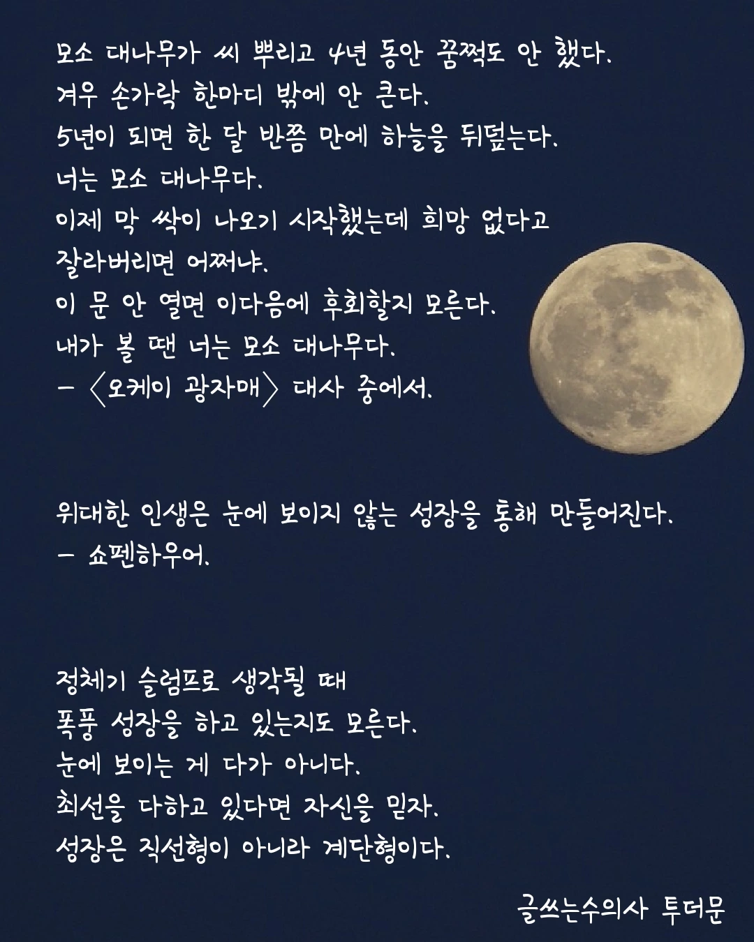 모소 대나무가 씨 뿌리고 4년 동안 꿈쩍도 안 했다. 겨우 손가락 한마디 밖에 안 큰다. 5년이 되면 한 달 반쯤 만에 하늘을 뒤덮는다. 너는 모소 대나무다. 이제 막 싹이 나오기 시작했는데 희망 없다고 잘라버리면 어쩌냐. 이 문 안 열면 이다음에 후회할지 모른다. 내가 볼 땐 너는 모소 대나무다. - 〈오케이 광자매〉 대사 중에서.