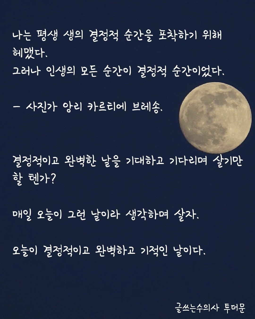 사진가 앙리 카르티에 브레송은 이런 말을 남겼다고 한다. “나는 평생 생의 결정적 순간을 포착하기 위해 헤맸다. 그러나 인생의 모든 순간이 결정적 순간이었다.” 그래서 나는 완벽한 때를