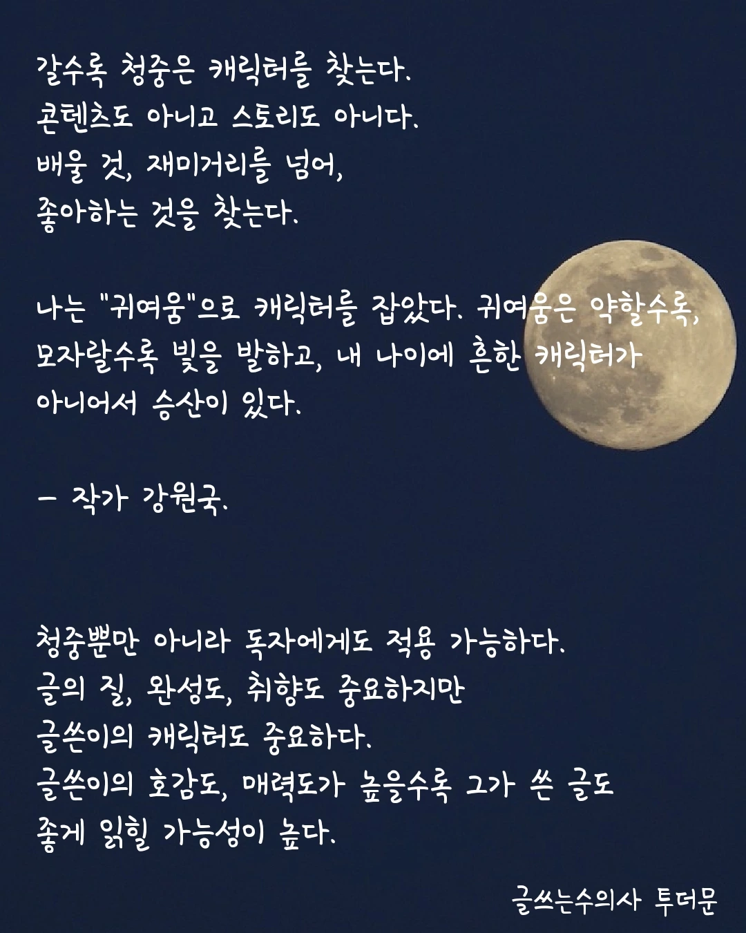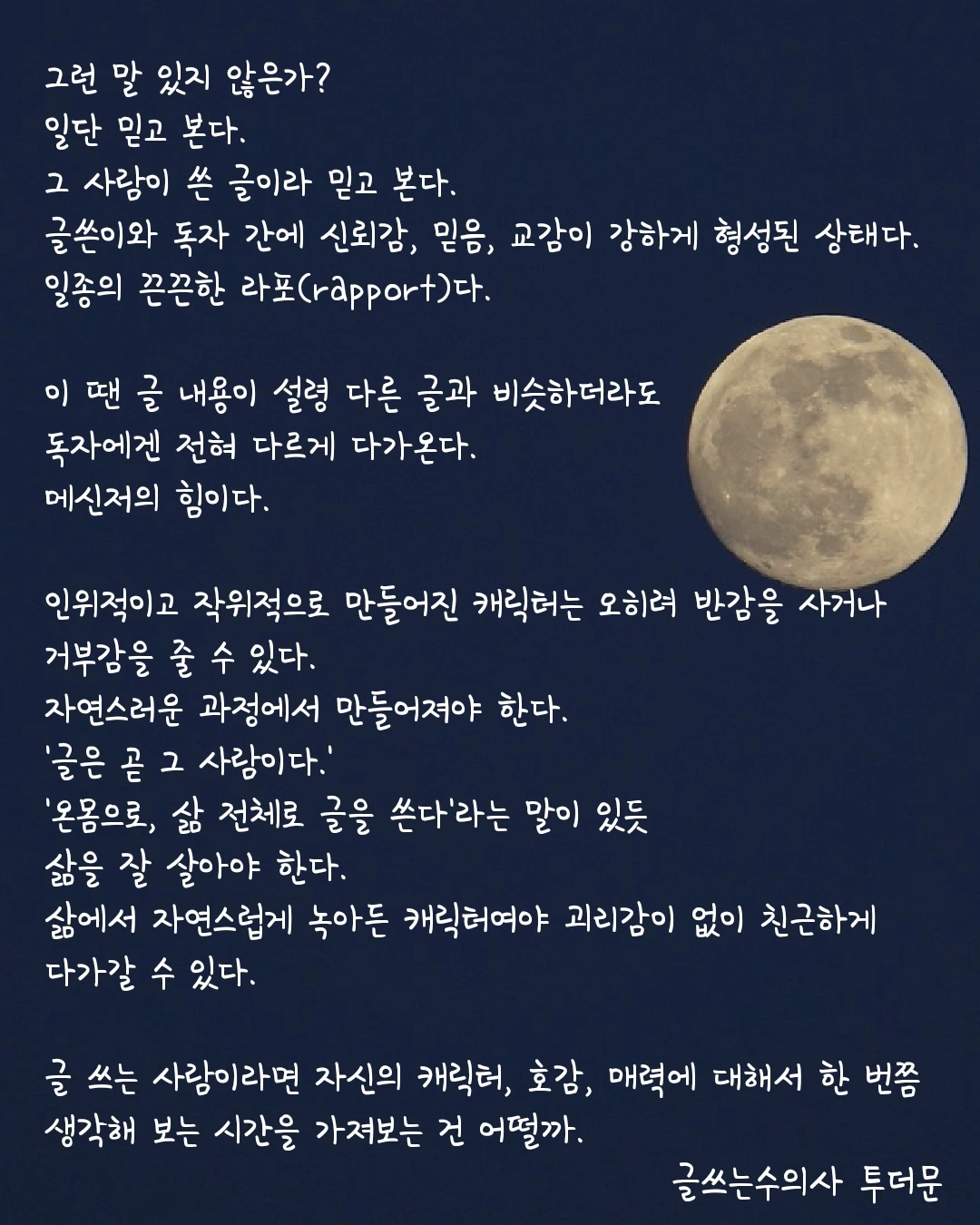 글 쓰는 사람이라면 자신의 캐릭터, 호감, 매력에 대해서 한 번쯤 생각해 보는 시간을 가져보는 건 어떨까.