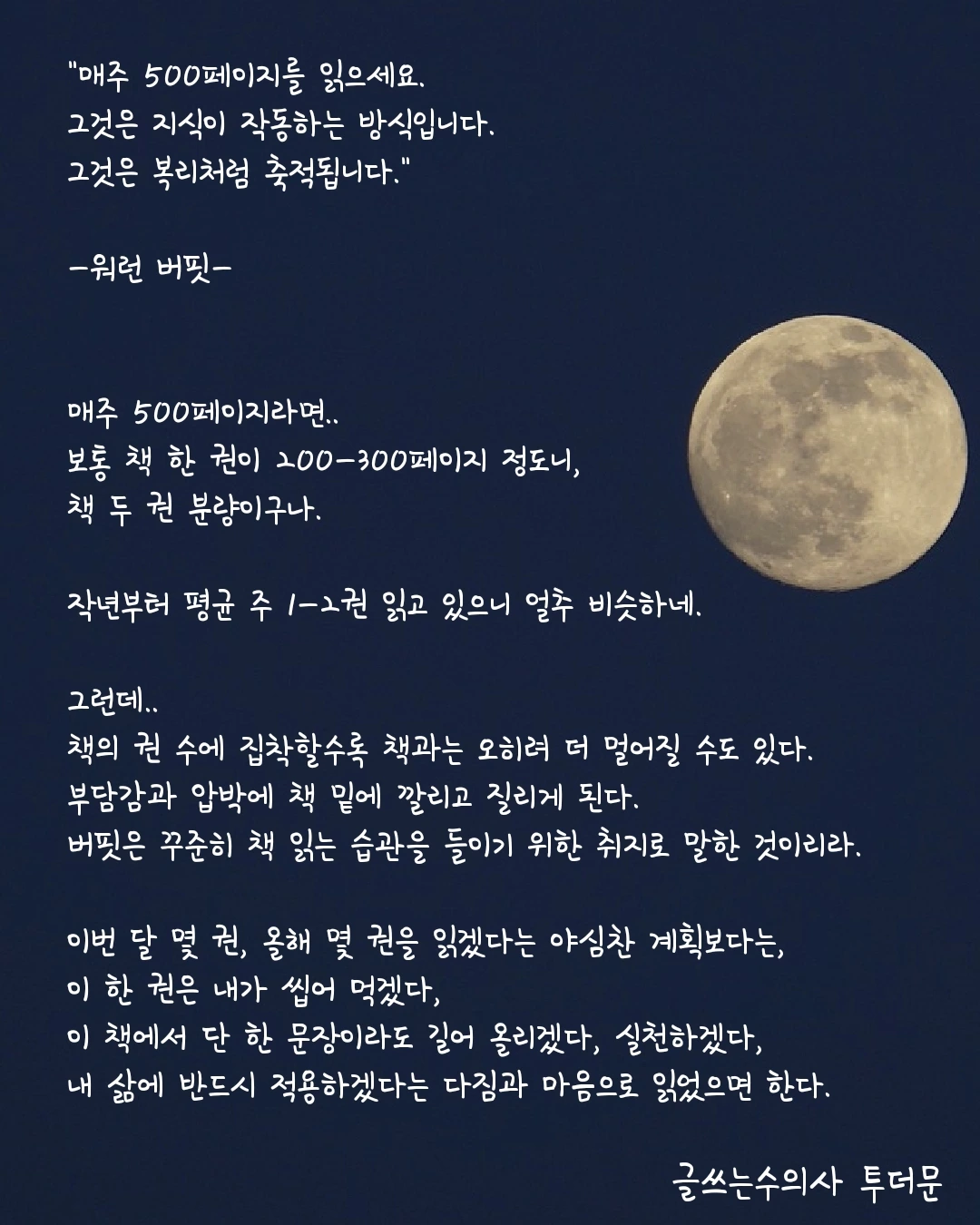 그런데.. 책의 권 수에 집착할수록 책과는 오히려 더 멀어질 수도 있다. 부담감과 압박에 책 밑에 깔리고 질리게 된다. 버핏은 꾸준히 책 읽는 습관을 들이기 위한 취지로 말한 것이리라.