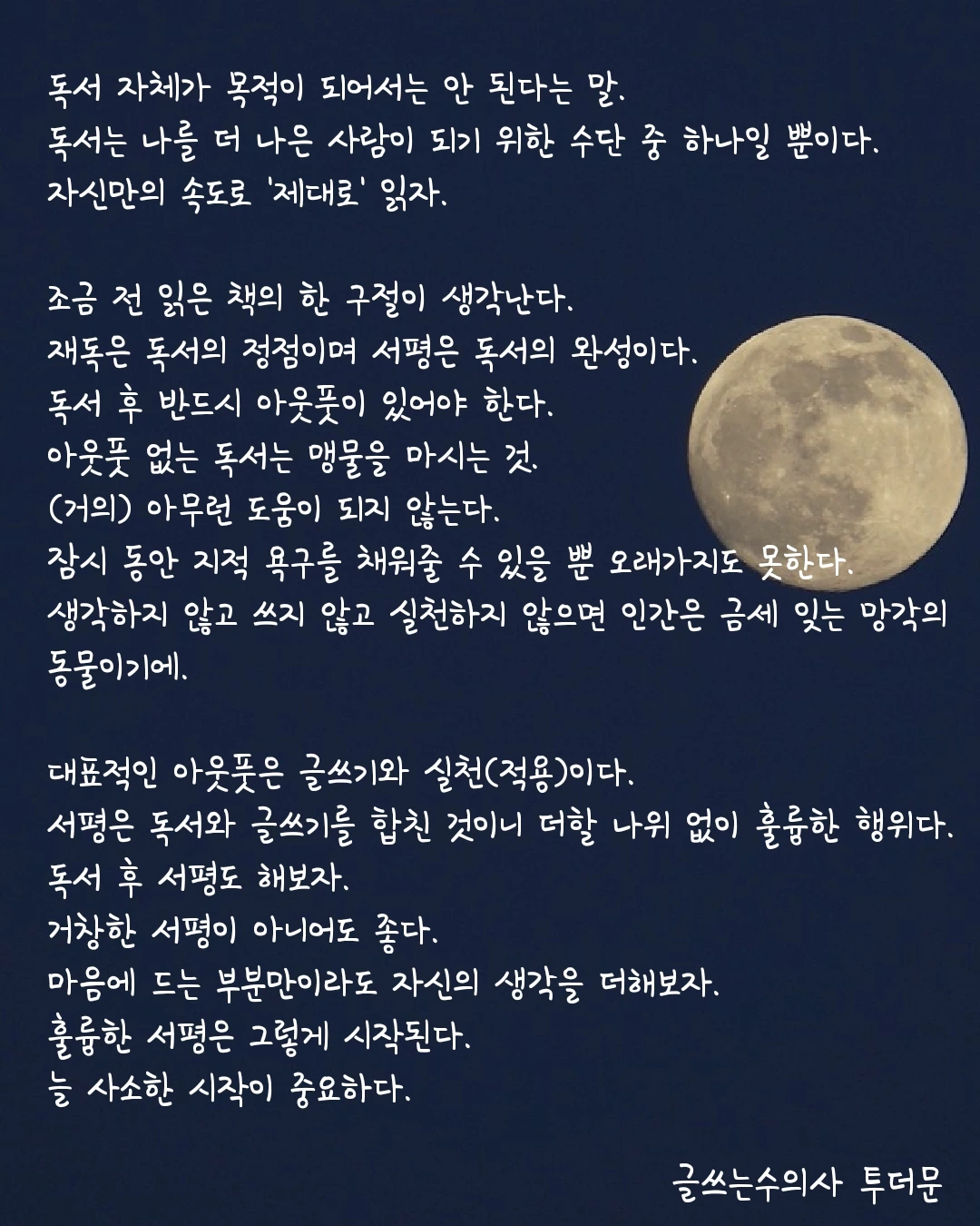 대표적인 아웃풋은 글쓰기와 실천(적용)이다. 서평은 독서와 글쓰기를 합친 것이니 더할 나위 없이 훌륭한 행위다. 독서 후 서평도 해보자. 거창한 서평이 아니어도 좋다. 마음에 드는 부분만이라도 자신의 생각을 더해보자. 훌륭한 서평은 그렇게 시작된다. 늘 사소한 시작이 중요하다.