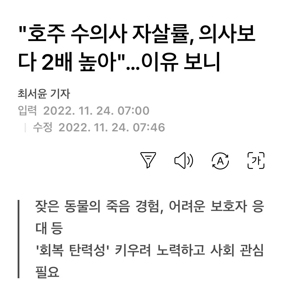 X의 글쓰는수의사 투더문(Tothemoon)님(@Tothemoon_Park) https://t.co/mSTP0Ox6VD 미국 CDC 국립보건통계센터가 2019년 발표한 자료에 따르면, 1979년부터 2015년까지 약 400명의 수의사가 스스로 생을 마감했다. 남성 수의사의 자살률은 일반인보다 2배, 여성 수의