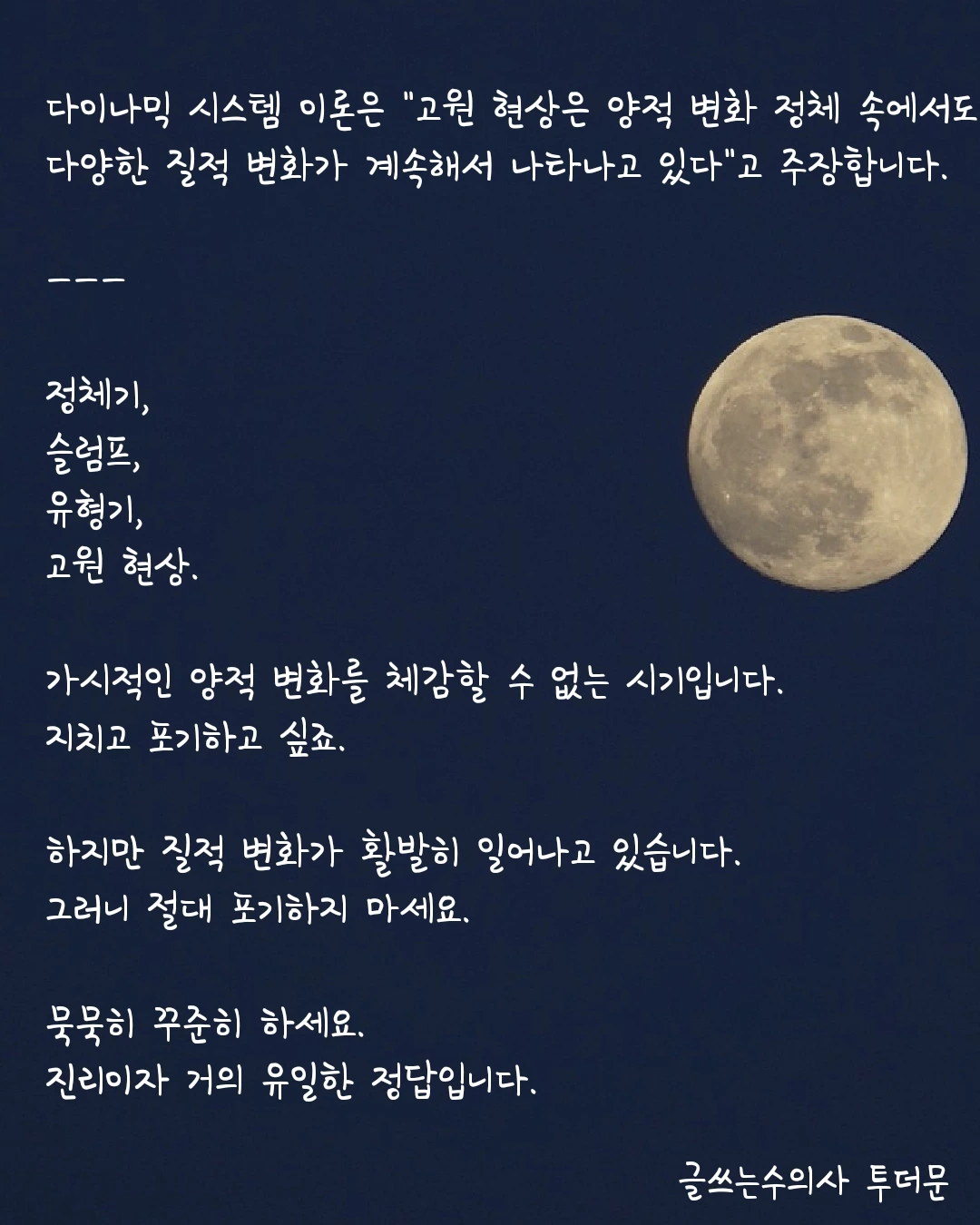 X의 글쓰는수의사 투더문(Tothemoon)님(@Tothemoon_Park) 열심히 하는데 안 느는 것 같다? 1. 열심히 안 한 거다. 열심히 했다고 착각한 거임. 2. 유형기다. ✅️https://t.co/6dm4RhiskE 늘지 않는 것처럼 느껴지지만 뿌리는 열심히 자라고 있다. 그러니 조금만
