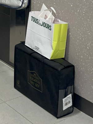 친언니가 임신 중인 동생의 스트레스가 나아지길 바라며 5만 원 상당의 소불고기 세트를 보내주어서 그거와 내가 직접 뚜레쥬르에 가서 산 2만 원 상당의 과자 세트를 문 앞에 두고 편지를 위에 잘 보이게 껴서 놓았다.