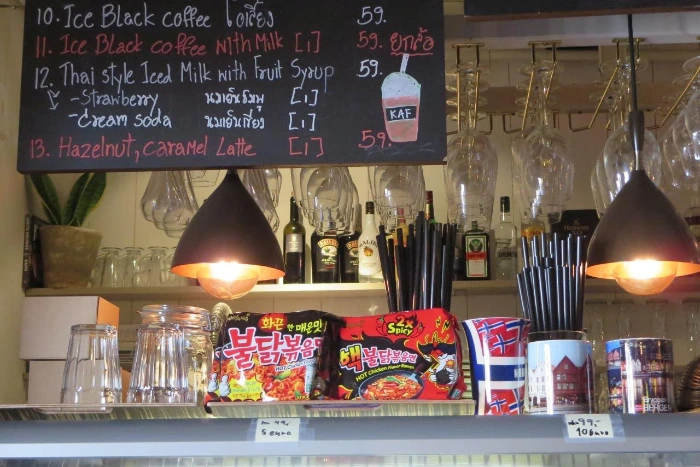 생각지도 못한 곳에서 조우한 조국의 유명 상품이 잠시 당황스럽다. 파란 눈의 코쟁이들이 한국의 매운맛에 도전하는 영상을 간혹 보기는 했다만, 그 유행이 이 곳까지 퍼져있을 줄이야. 자랑스러운 마음 이전에 당황스러움이 먼저 앞선다. 아니 그건 그렇다 쳐도... 왜 라면이 이런 카페에 있는 거야? 주문하면 즉석 해서 끓여주기라도 하는 건가? 엄청 매워서 쉽게 못 먹을 텐데? 대체 저걸 누가 사는 걸까? 간혹 사는 사람이 있으니 팔고 있는 거겠지... 이런저런 생각이 무작위로 떠오르다 보니 황당한 기분마저 든다. 불닭볶음면 너는 대체 무슨 사연으로 이 먼 나라 작은 카페에 까지 와서 자리를 잡고 있는 것이냐. 하긴 나는 무슨 사연으로 어쩌다 이 엉뚱한 장소까지 와서 이런 생각을 하고 있는 것일까.