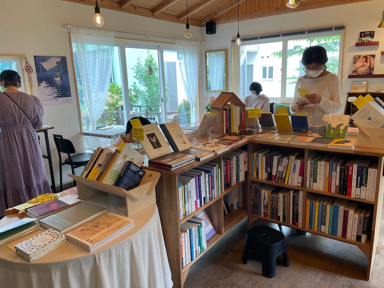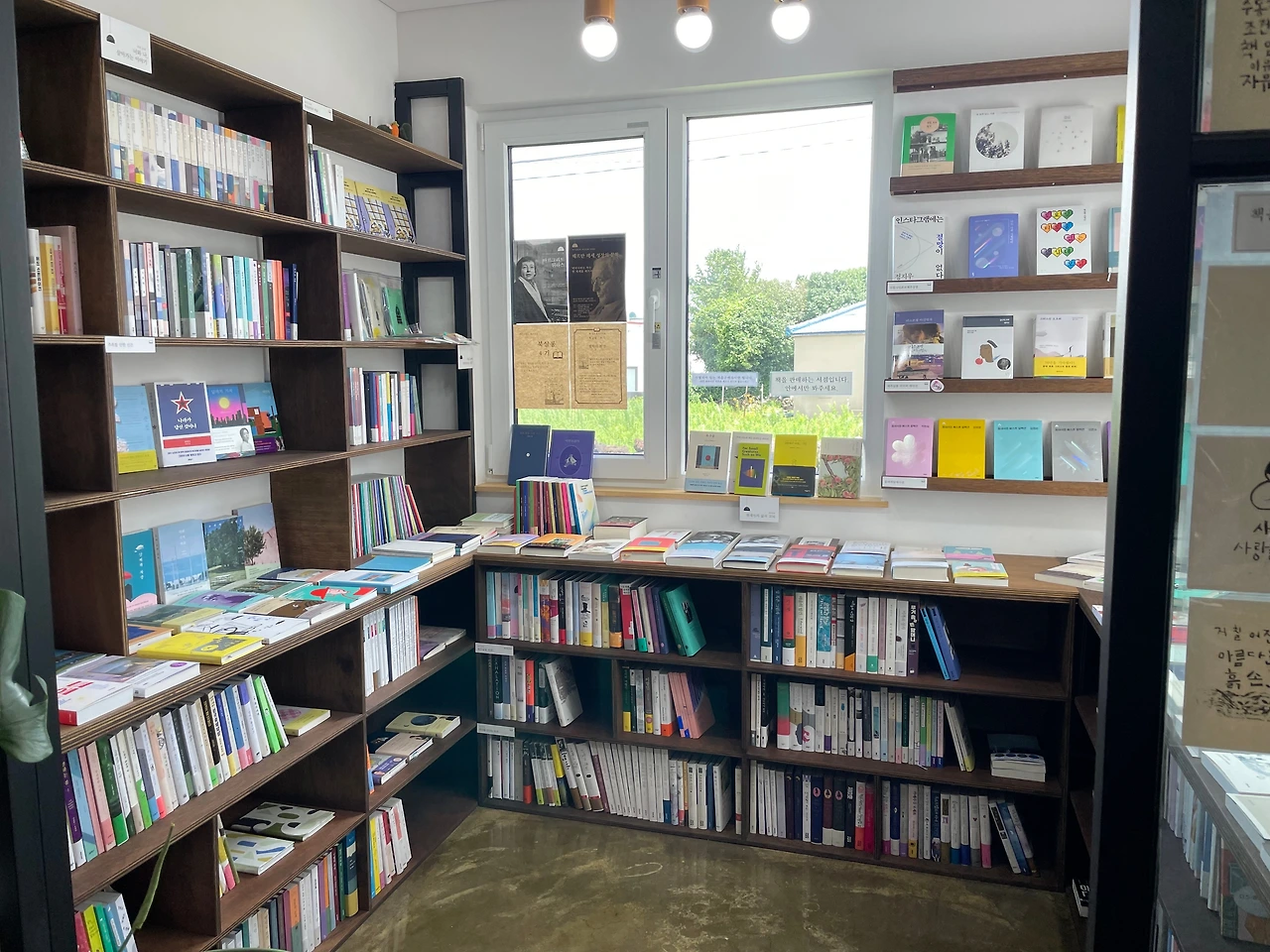 편도 1차선 길가에 세워둔 입간판을 잘 보지 않으면 그냥 지나칠 수 있는 마당이 있는 가정집 같이 생겼다. 주차는 길가에 방해되지 않게 알아서 세워두면 된다. 실내 한쪽 면은 꺼내 읽을 수 있는 중고책이 있고 판매하는 책은 창가와 실내 가운데 책장에 있다. 키높이 아래에 있는 책은 작은 좌식 의자를 꺼내서 앉아서 골라볼 수 있다.