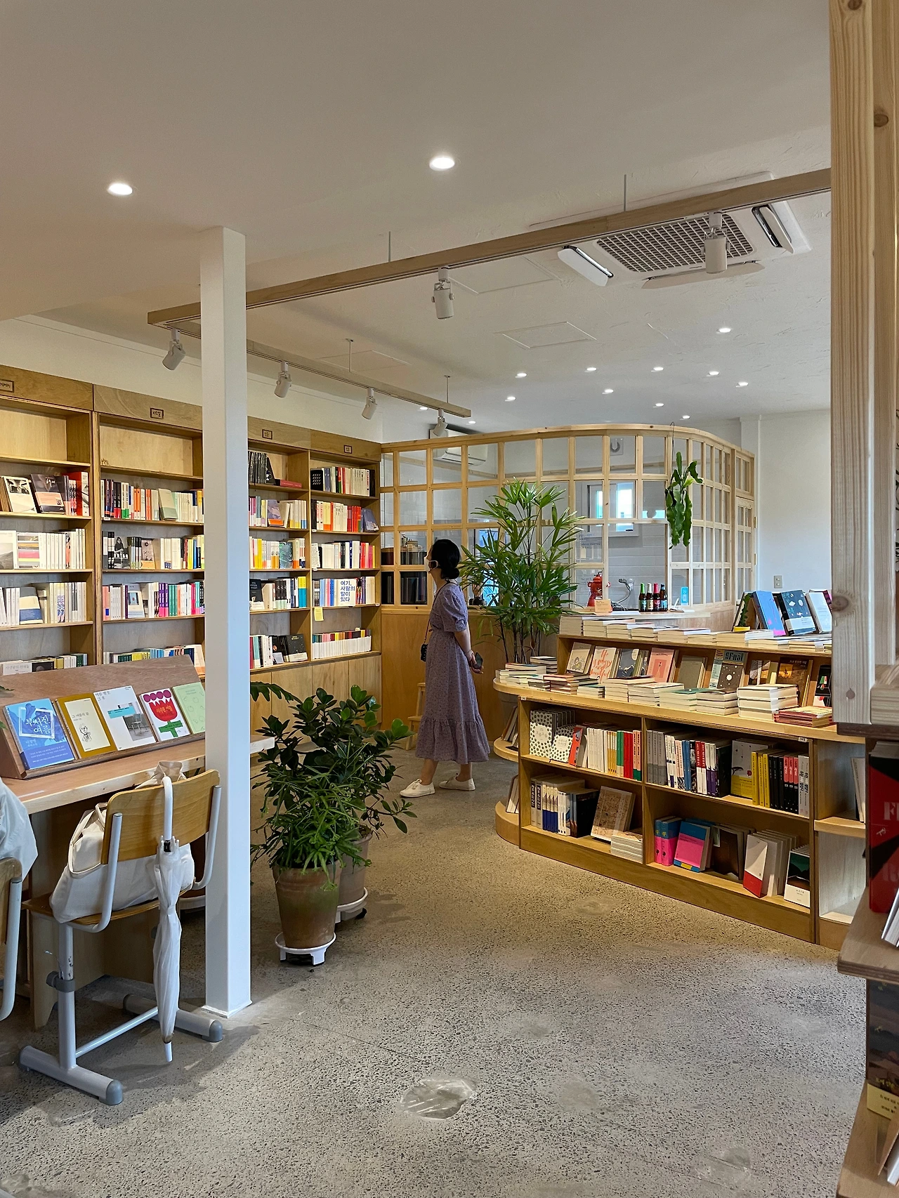 마당을 바라다 보는 일자로 길게 된 창가 자리가 있고, 작은 필사 공간이 있다. 책은 제주, 과학, 철학, 디자인, 만화, 문학 등 다양한 분야를 갖추고 있다.
