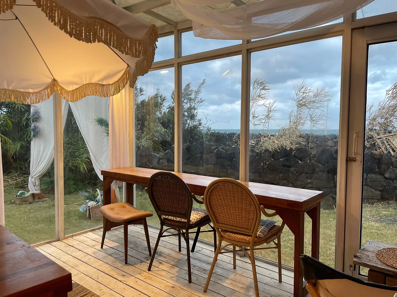 제주 전통 형태의 집 세 동이 디귿자 형태로 연결되어 있다. 마당을 가로질러 첫번째 건물로 들어가면 베이킹용 오븐과 빵 진열대, 그리고 카운터가 있고 자리가 몇 개 있다. 두 번째 건물러 넘어가는 중간에 제주 돌담 넘어 바다를 볼 수 있는 지붕과 유리창을 가진 자리가 있다.