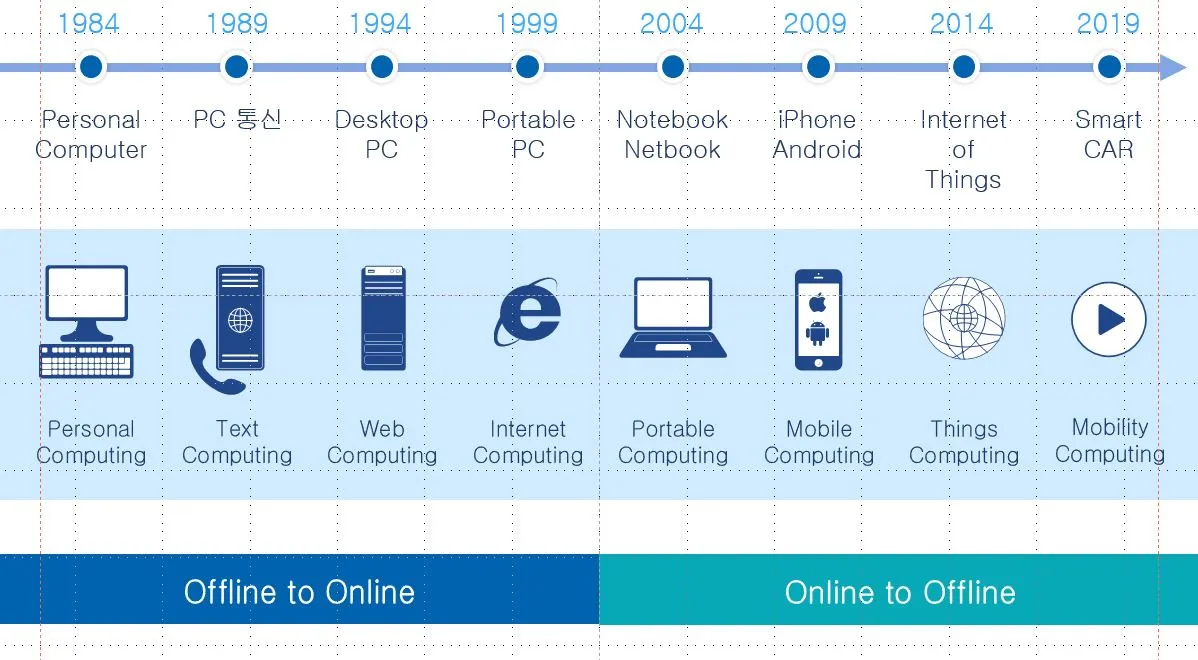 지나온 30년의 시간에 변곡점을 적어 보자면, PC통신의 등장으로 Text 기반의 인터넷이 시작되었고, Web의 등장으로 그래픽 환경의 인터넷이 활성화되었으며, 2009년 아이폰의 출시로 fixed computing에서 mobile computing으로 바뀌는 것이 큰 변화였던 것 같다.