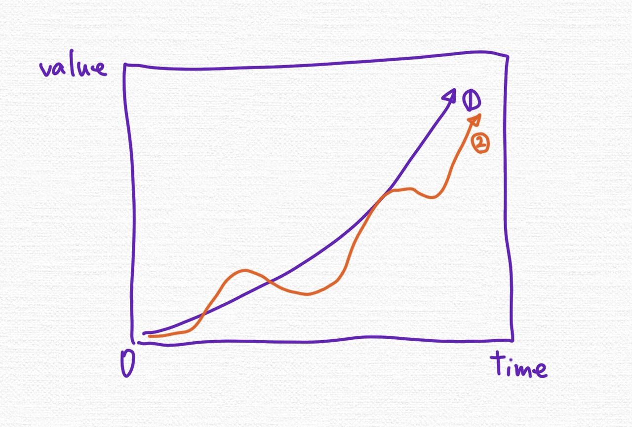 그런데 그 ‘가치’라는 것은 직선적으로 한 번에 쌓을 수는 없고, 때로는 조금씩 가끔은 한꺼번에 많이 쌓아나가게 된다. 여기서 중요한 것은 ‘가치’를 더할 수 있는 지식과 경험을 꾸준히 해 나가는 것이 중요하다. 성공했다고 하는 사람들의 이야기를 들어보면 자신이 가진 것이 아니라 쌓아온 과정과 그 때에 느끼는 성취감과 행복이 성공이라고 말한다. 인생이 결과인가 목적인가 고민하는 사람들이 많은데, 사실 시간축에 꾸준히 쌓아가는 과정이 인생 아닐까 생각 한다.