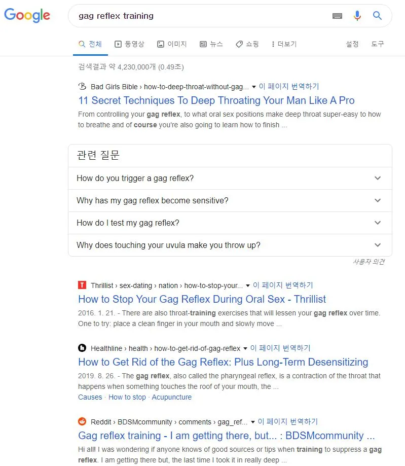 구토 반사를 검색하기 위해 gag reflex라는 단어를 넣었다. 그리고 이 gag reflex를 조절하기 위한 다른 훈련법이 있는지 알아보기 위해 gag reflex training을 검색했다.
