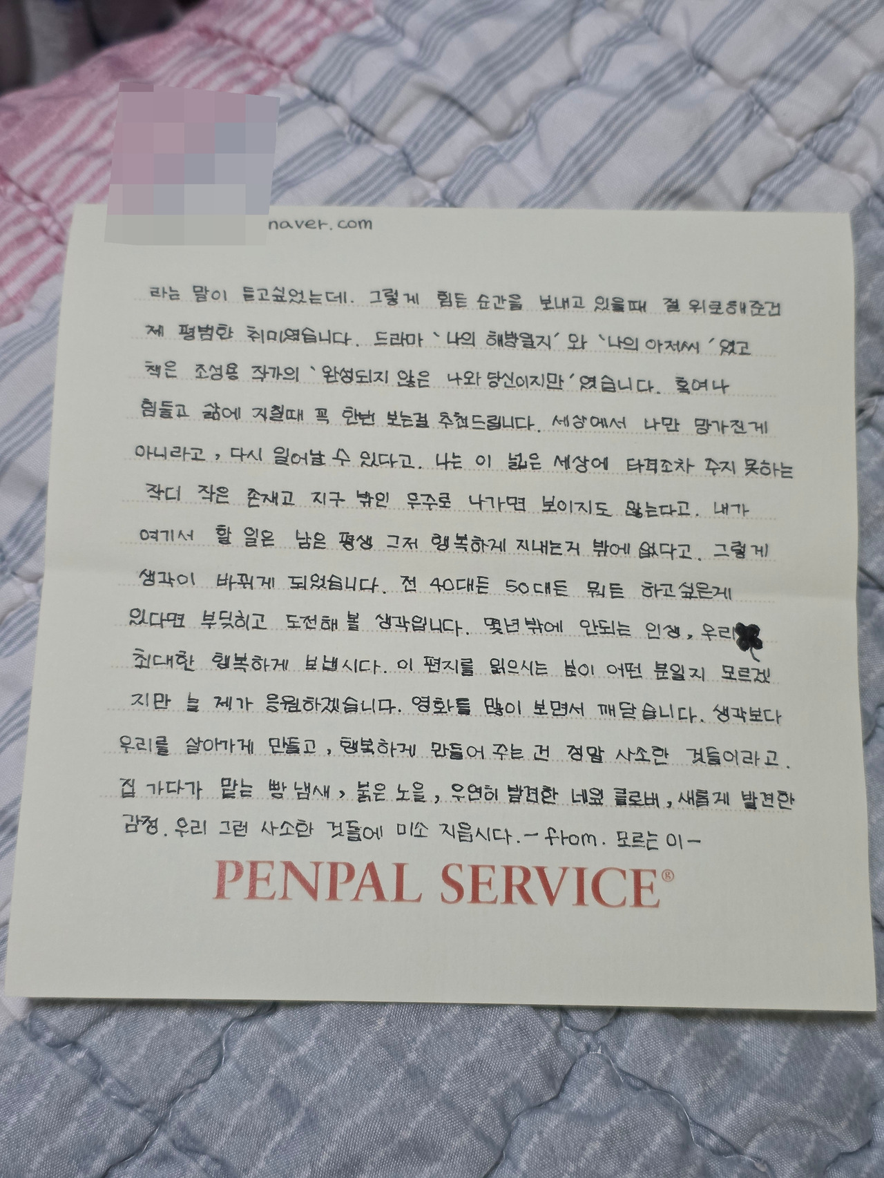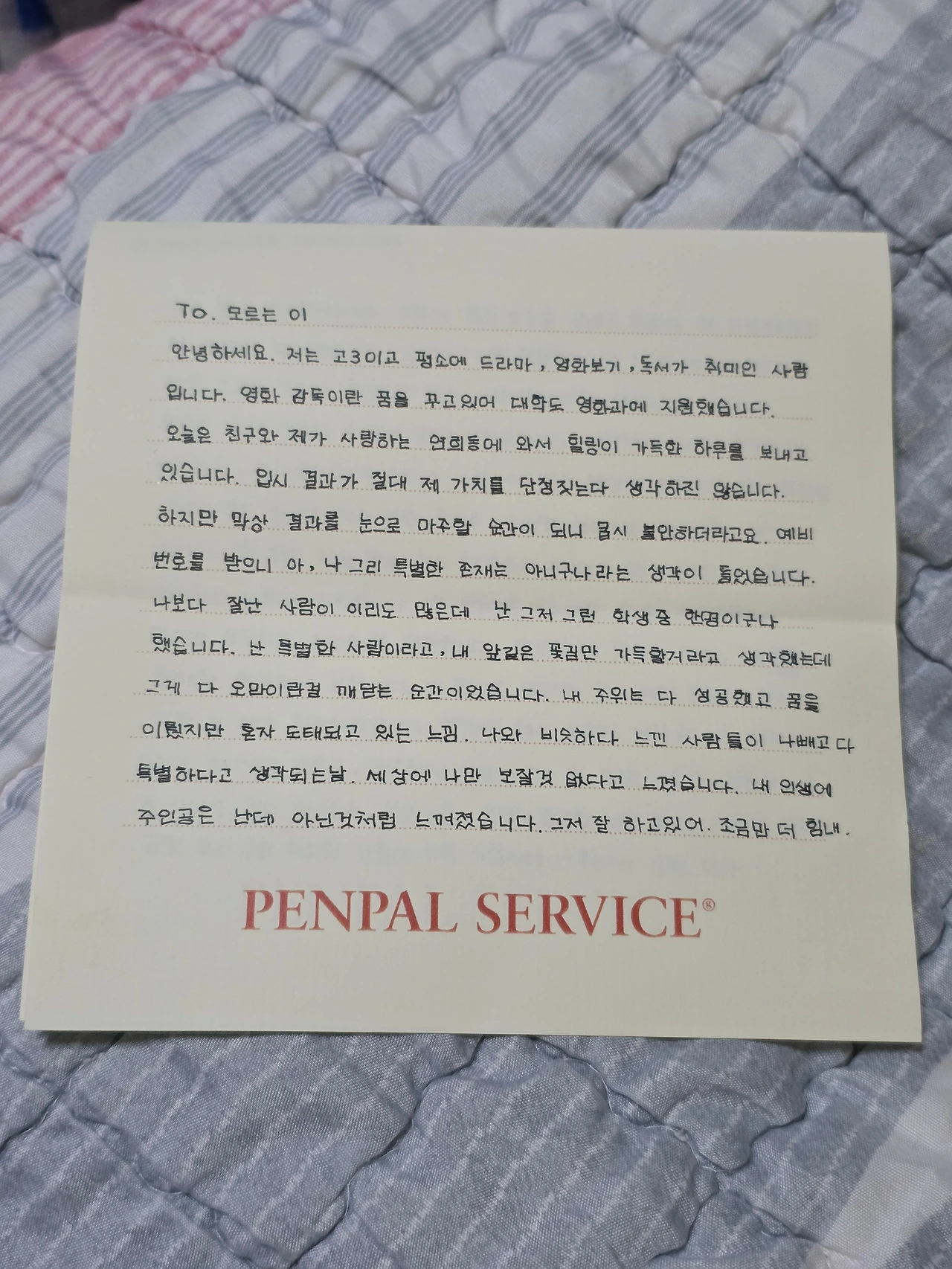 그곳에서 나는 안내에 따라 이름도 모르는 낯선 이에게 '힘든 시간을 건너는 이들에게'라는 내용으로 한통의 펜팔 편지를 썼다.