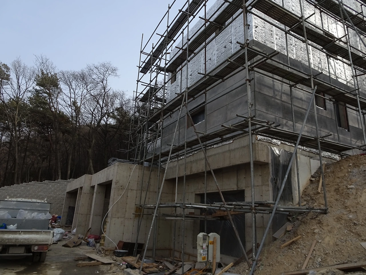 하지만, 실제 공사는 매우 더디게 돌아갔습니다. 8월부터 주차장이 올라갈 때만 해도 10월, 11월, 12월 지나면서 조금 늦어지는건 아닌지 걱정이 들기 시작했습니다. 다른 현장에 시공 책임자가 있으니 우리 집은 아무도 신경쓰지 않았고 건물은 12월이 되어서도 골조만 올라가게 됩니다.