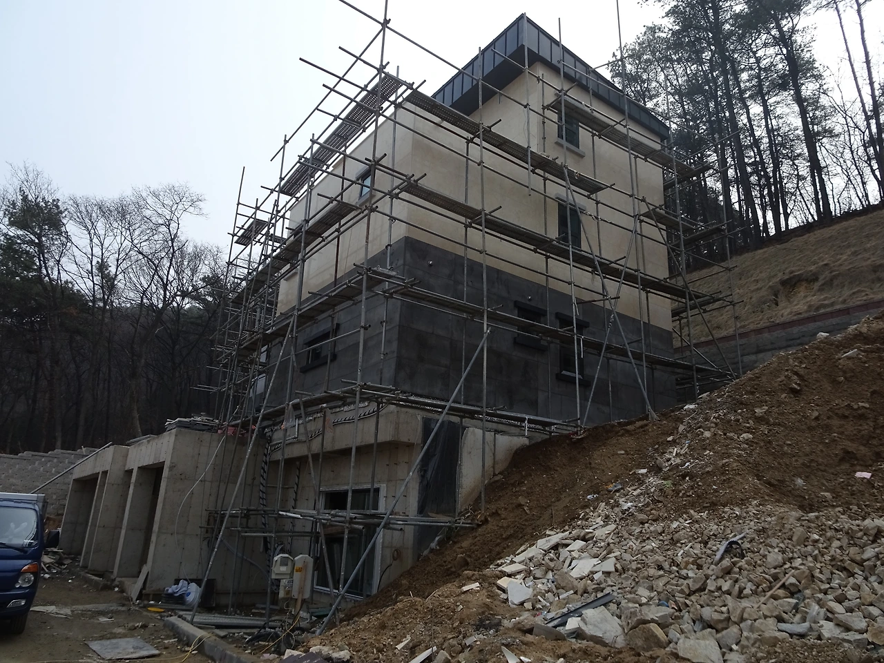 이제는 완공예정일에 공사가 끝날 수는 없을 듯 했습니다. 임시로 사는 집에는 계속 한 달만 더, 한 달만 더 있게 해달라고 부탁을 하게 됩니다. 2018년 2월까지도 여전히 골조와 단열, 외부 공사가 진행중이게 됩니다. 이 때 또 황당한 일이 발생합니다. 갑자기 외벽 석재 공사비용은 추가라는 것! 목재공사 평당 450만원에서 철근으로 바꾸며 평당 550만원으로 상승하고 개발부담금까지 제외되었는데 갑자기 그동안 이야기하지 않은 외부석재공사비용을 약 2천만원 정도를 추가로 요청하는 것이었습니다. 현재 금액은 스타코 시공 기본이라는 것입니다. 더 이상 금액을 낼 수 없다고 판단하여 그러면 원래 기본 스타코 시공으로 견적을 냈다고 주장하니 이미 단열 시공방법이 석재공사를 염두해두어 이를 수용할 수 없다고 주장합니다. 이를 두고 더 이상 진행이 어렵다고 하자, 우선은 자신들이 비용을 부담하여 진행하겠다는 이야기를 하고 석재 공사를 시작하게 됩니다.