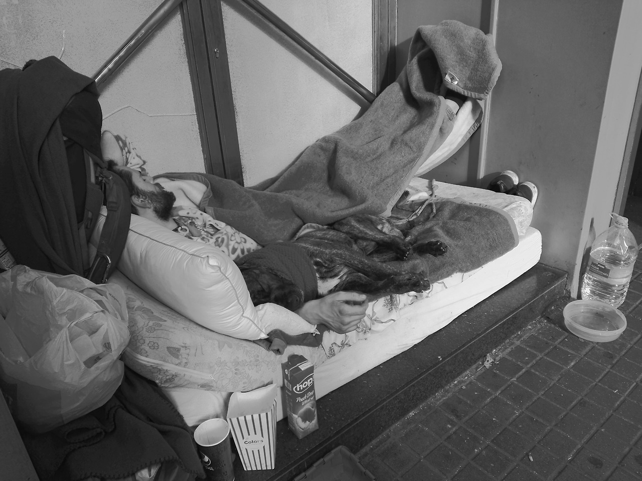추운 겨울, 밖에서 자는 것이 녹록지는 않을 것이다. 아마도 자신도 많이 추울 듯하다. 그런데, 자세히 보면 목도리를 개에게 걸어서 자고 있는 모습을 볼 수 있다. 자기는 오히려 추위를 그대로 맞아도, 함께 자는 개에게는 목도리를 걸어주고, 팔베개를 하고 자는 모습을 볼 수 있었다. 비단, 이 노숙자만이 아니라 많은 개를 데리고 있는 노숙자들은 자기는 먹을 것이 좀 부족하더라도, 먹을 것이 생기면 개에게 나눠주고, 비스킷 등을 사놓는 모습을 어렵지 않게 볼 수 있었다.