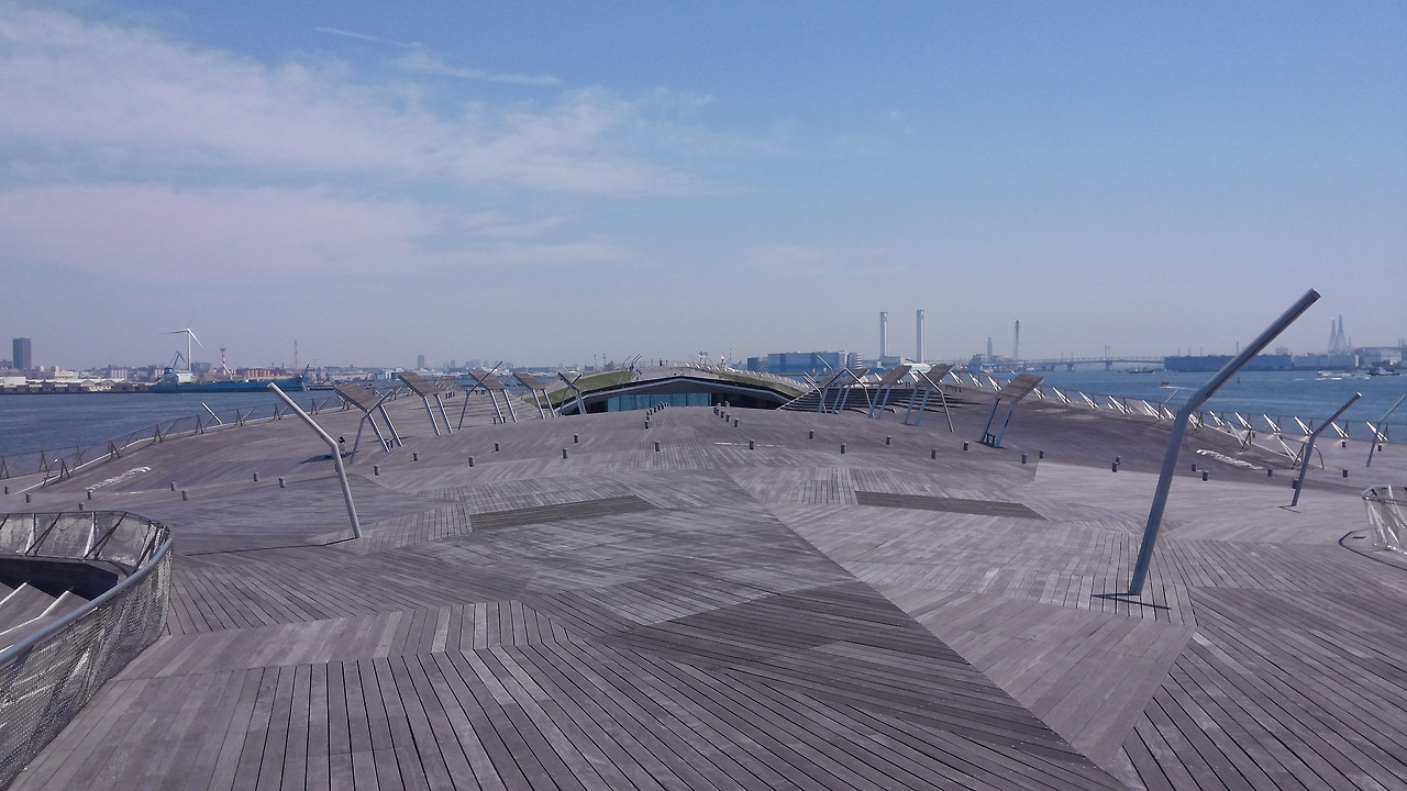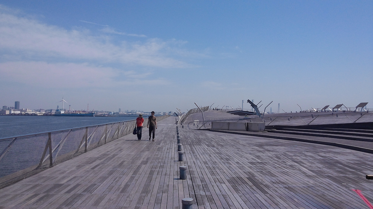 오산바시 여객선 터미널의 상층부로 가는 것은 굳이 계단을 이용하지 않아도 된다. 나무 데크가 경사를 만들어 주어 경사를 따라 조금씩 올라가면 상층부로 연결된다. 휠체어를 이용하든, 유모차를 동반하든, 캐리어(짐)를 끌고 오든, 그것이 이곳 방문에 어려움을 주지는 않는다. 그렇게 올라가면 요코하마 바다가 한 눈에 보이는 넓은 시야가 펼쳐진다. 그리고 나무 데크는 사람들을 걷고 싶게 만들게, 또 운동하고 싶게 만드는 공간이 된다.