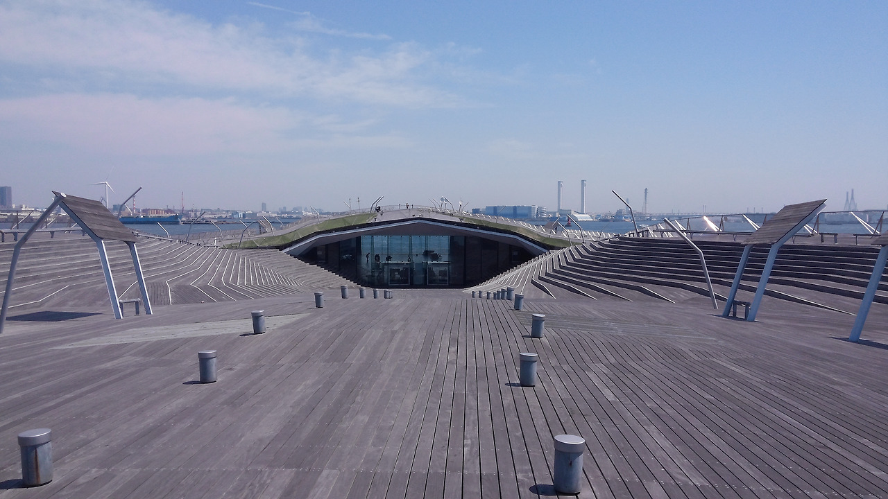 이러한 볼거리를 뒤로 하고, 원래의 목적지인 오산바시 국제여객선 터미널로 발걸음을 옮겼다. 멀리서부터 보여지는 모습이 참 독특했다. 분명 터미널은 터미널인데, 나무 데크가 터미널을 감싸고 있고, 데크의 높낮이가 연결되어 있어 자연스럽게 위 아래로 이동할 수 있는 모양이었다.