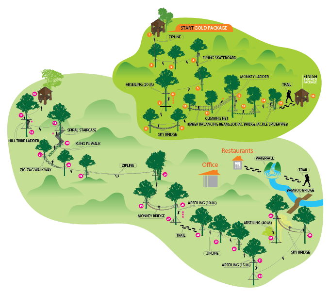 짚라인은 3가지 정도의 코스로 운영이 된다. 골드, 실버, 브론즈 코스 등인데, 가장 많은 코스를 이용하는 골드 코스로 예약을 했다. 그런데 코스 안내도를 보는 순간! 괜히 했나 싶었다. 총 35개의 코스로 이루어진 이 짚라인 코스는 모두 타고 내려오는데만 약 3시간 정도가 소요된다.