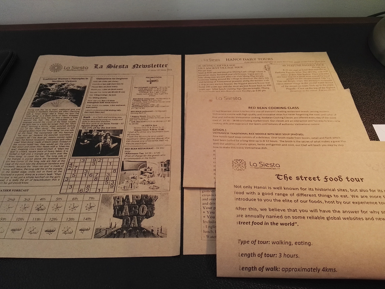 라 시에스타 호텔&스파는 자체적으로 뉴스레터를 만들어서 객실에 비치해놓는다. 하노이에 처음 오는 사람들에게 몇 가지 여행 정보, 날씨 등을 알려주고, 심심할 때 즐길 수 있는 스토쿠라든지, 쿠킹 클래스, 스트릿 푸드 투어 등의 정보도 제공해준다. 어떠한 측면에서는 여행 상품 판매의 일환일 수도 있겠으나, 그 안에서 알고 싶은 정보를 함께 제공해준다는 것 자체는 꽤 훌륭한 서비스로 느껴졌다.