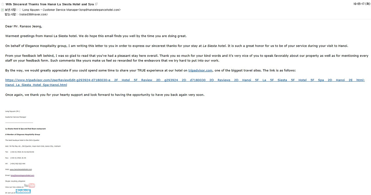 라 시에스타 호텔&스파에서는 많은 호텔과 마찬가지로 체크아웃 시 호텔에 대한 평가를 실시하고 있다. 체크 아웃 전날 밤 설문지를 갔다 놓고 이 설문지를 체크하여 체크아웃 때 보내주도록 하고 있다. 물론, 많은 이들이 실제로 만족한다고 평가했을 것 같다. 그러고 나서 하루 이틀이 지나면, 아래와 같이 메일이 한 통 온다. 호텔에 대해 그렇게 만족했다면, 트립어드바이저에 리뷰를 달아달라고!