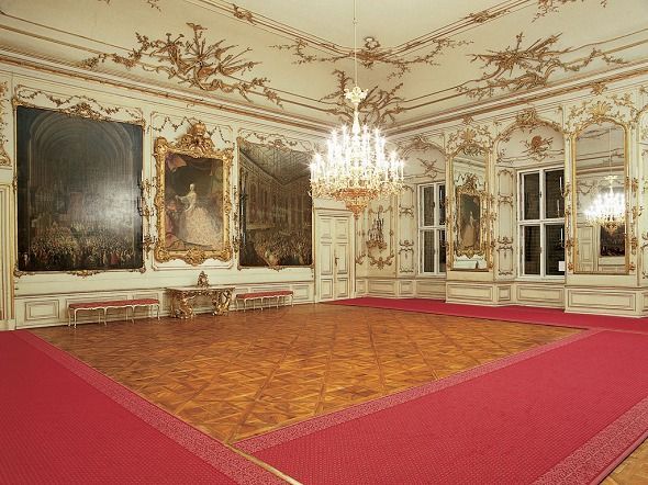 특히 천정 프레스코화에는 마리아 테레지아의 통치를 찬양하고 있는 장면을 보여주는데 그림 중앙에 프란츠 쉬테판과 마리아 테레지아가 옥좌에 앉아 있고 그 주변에는 통치자의 미덕과 세습 국의 모습을 보여주는 상징물들이 그려져 있다.