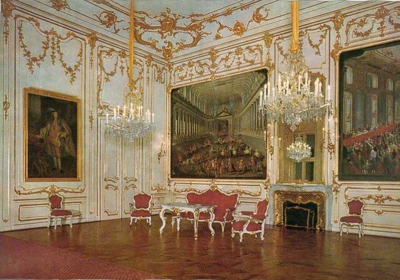 길이가 40미터 이상이고 폭이 거의 10미터에 달하는 이 대 갤러리는 궁정 행사를 치르는 데 아주 적격이었다. 크리스털 거울들과 금박의 석고 세공 장식, 그리고 천정 프레스코들로 이루어진 이 홀은 로코코 시대의 총체적인 예술을 보여주고 있다.