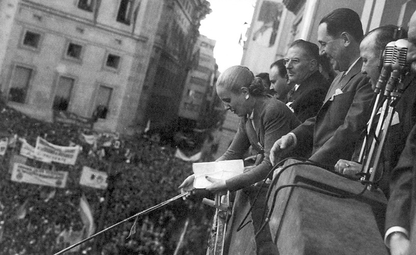 1944년, 산 후안 지진이 발생하자 당시 노동부 장관이었던 후안 페론이 이재민 구호를 위한 기금 마련 행사장에서에바를 보고 사랑에 빠져 결혼하게 된다. 1946년 후안 페론이 대통령에 취임하자 영부인이 된 에바는 자신이 과거에 겪었던 가난한 이들의 삶과 고통에 가장 먼저 눈을 돌리고 본능적으로 노동자 및 하층민들에게 위한 정책을 펼친다. 또한 그녀는 프랑스의 드골 대통령에게 식량 배급 약속을 받거나 스페인에서의 아동 구호 활동으로 국민들의 인기를 한 몸에 받았다. 이로 인해 남편인 후안 페론의 인기도 치솟아 올랐다.