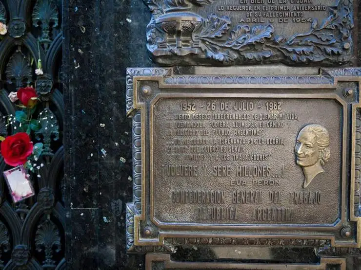 많은 여행자들이 이 곳을 찾는 이유는 에바 페론의 묘지를 보기 위해서이다. 1919년 5월 7일, 부에노스 아이레스 주의 작은 마을에서 사생아로 태어난 에바 페론은 가난하게 살아가면서도 배우의 꿈을 포기하지 않았다. 그녀는 꿈을 이루기 위해 모델과 연극배우 그리고 라디오 성우 등 다양한 활동을 하였으며 그 결과 유명한 영화배우가 되었다.