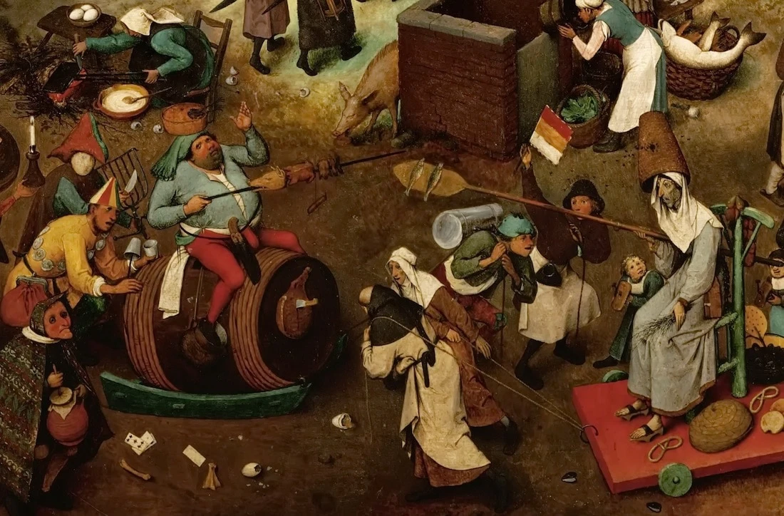 재미있는 것은 브뤼겔이 일련의 행사를 대립되는 세력의 싸움으로 그렸다는 점이다. 두 세력은 서로 무시할 수 없는 세상의 절반들이다.
