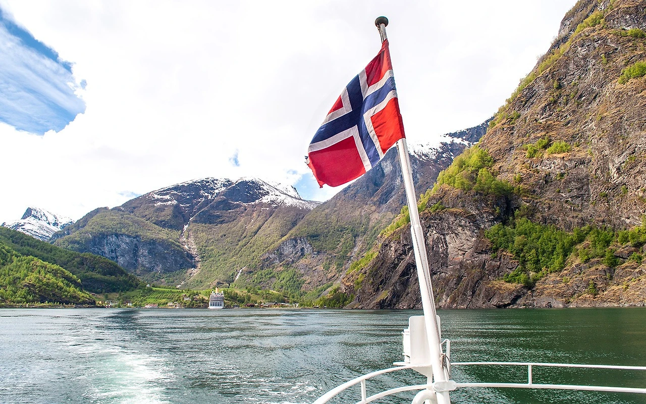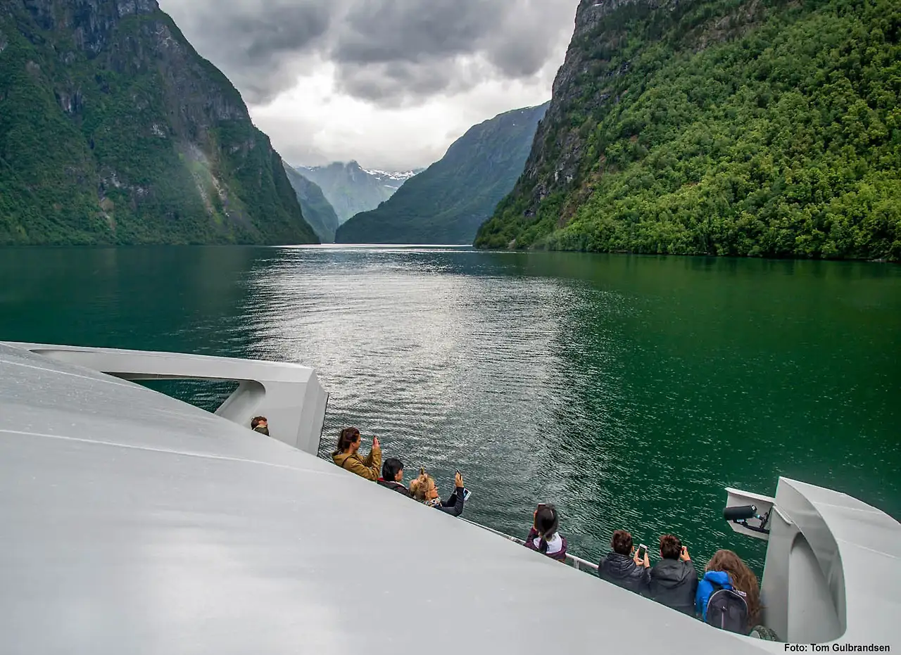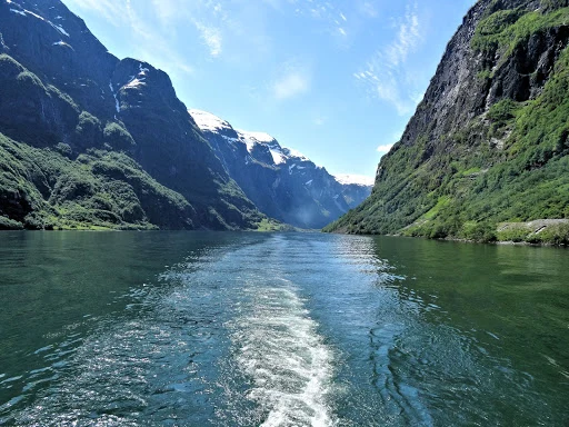 산과 하늘 그리고 구름을 거울처럼 반사하는 물살을 가르며 크루즈가 미끄러지듯이 움직여 나가면 유람선 뒤로 플롬은 그 모습을 완전히 드러내었다가 점차 사라져 간다. 마을은 보이지 않고 유람선이 협곡의 구비를 돌아가자 피오르드의 장대한 자태가 서서히 나타나기 시작한다.